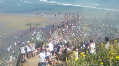 There was one Holi event yesterday and one today - we ended up participating in today's event because it was meant to be the "undergraduate" one, i.e. more party ;) Both events were directly at the beach so we could wash of the color immediately afterwards - but we didn't and walked around as smurves on the beach.That was fun since a lot of people recognized where we had been and commented "That was fun, eh?". Fortunately, after intensive scrubbing the color goes off your skin and I don't feel any damage to my lungs. I got a pair of white shorts and a T-shirt colored for free... and a sunburn, I guess, but that might be some rests of color as well ;)